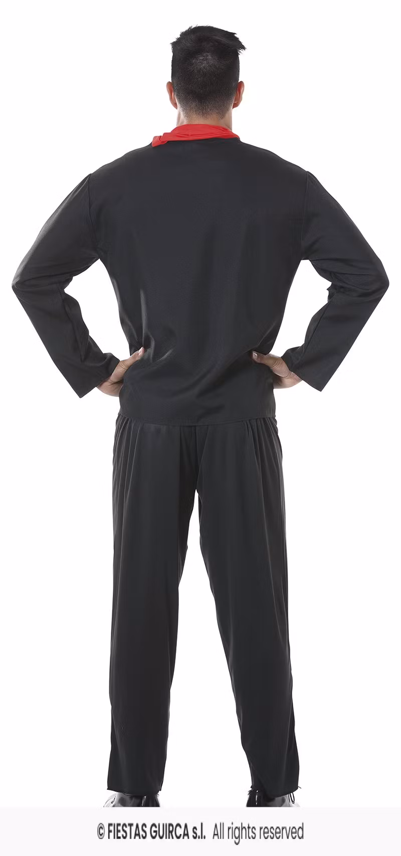 Innehåller: svart heldräkt med skelett tryck framtill samt snörning bak nacken. Svart jacka med dekorationer samt ett rött midjeband samt matchande scarf.